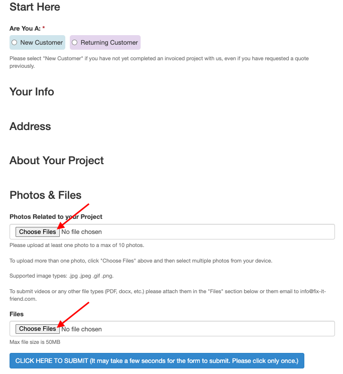 If you suspect that the photos or files might be causing the form to not submit properly, please submit the completed form (all required fields) without the photos/files and to send the photos/files in an email to info@fix-it-friend.com.